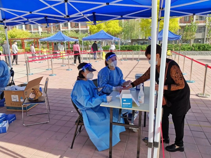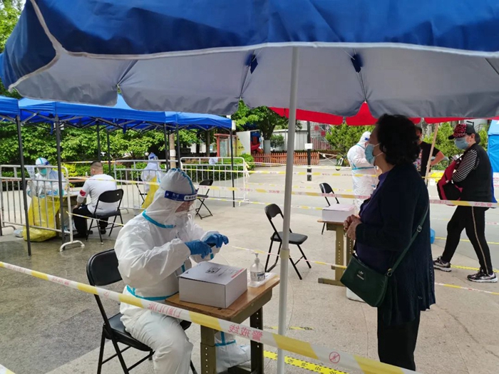 共产党员张增惠在延静里社区华商大厦检测点参加防控志愿服务。