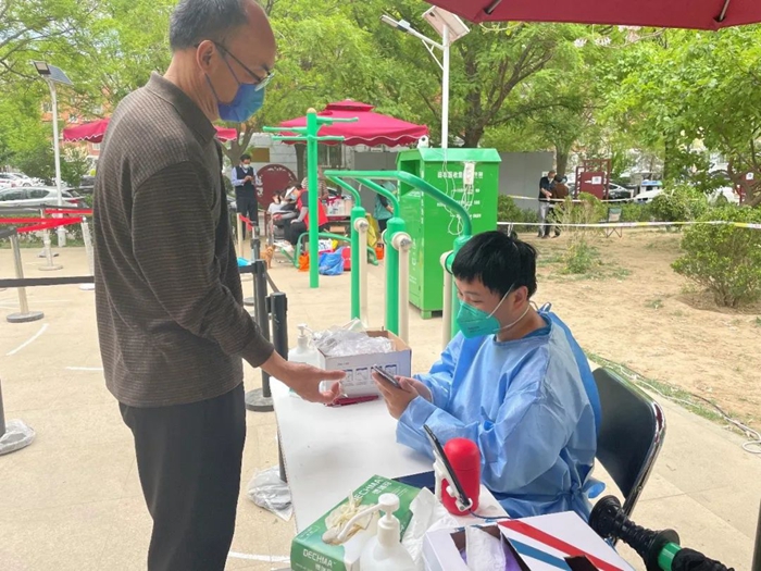 共产党员张馨羽参加丰台区西马小区社区进行核酸检测队伍疏导或信息录入工作。
