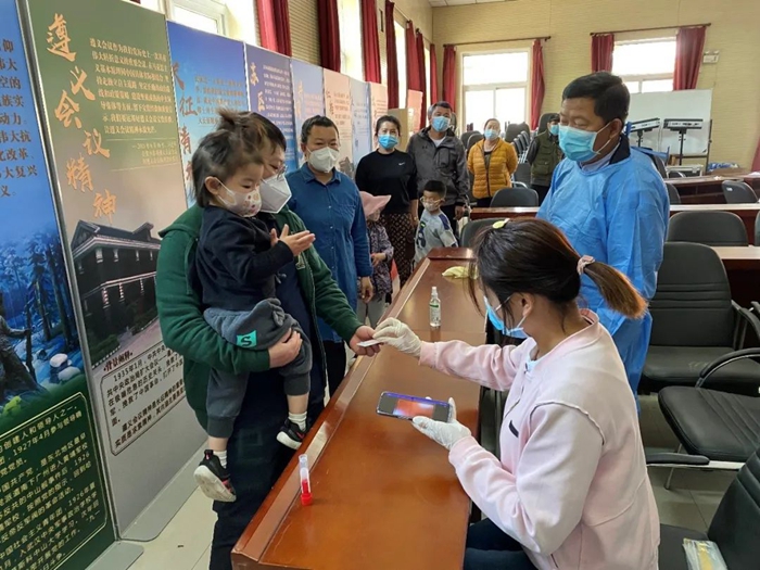 入党积极分子徐阳在中国航天社区进行核酸检测队伍疏导或信息录入工作。