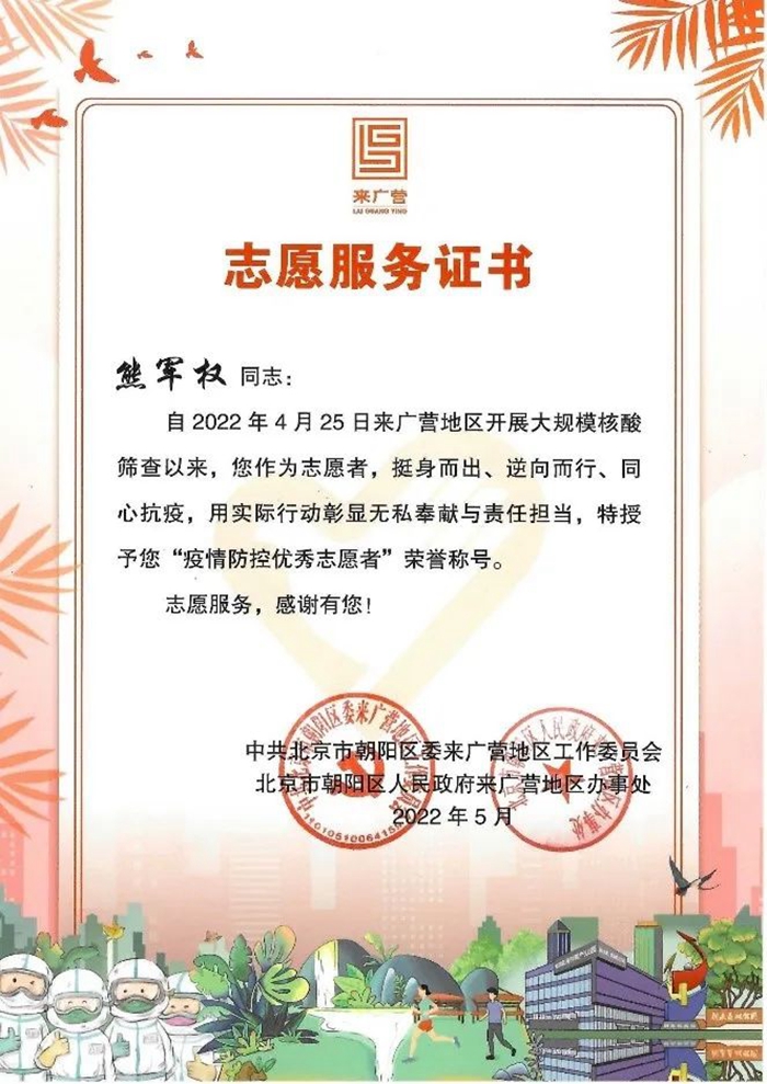 5月初,我接到通知,就近到所属朝阳区劲松东社区参加社区防疫工作。早晨,我准时到达社区门口,开始了一天紧张而又充实的工作,社区居民对米乐官方网站_米乐(中国)股份有限公司前去支援的志愿者非常热情,“小伙子哪个单位的、感谢你来米乐官方网站_米乐(中国)股份有限公司社区帮忙啊!”大妈说。