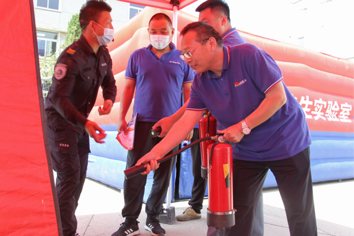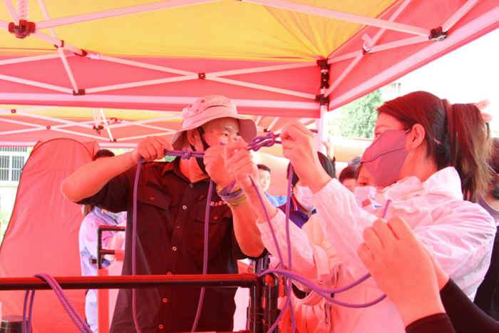 活动现场,专家讲师在高温天气下,为公司职工详细讲解了心肺复苏要领和AED的使用方法,开展了自救结绳演练、模拟灭火体验、模拟通道烟雾逃生等应急活动。