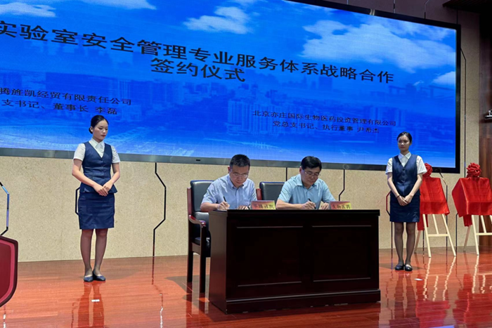 6月27日下午,亦庄医药产业园危化品统一配送服务平台、科研实验室安全生产教育培训学院揭牌仪式举行,北京亦庄国际生物医药投资管理有限公司党委书记尹希杰,华腾化工党总支书记、董事长李磊代表双方签署了战略合作协议,经开区城市运行局相关领导,医药园相关单位,华腾化工、华腾旌凯相关领导出席签约和揭牌仪式,近百人参加。